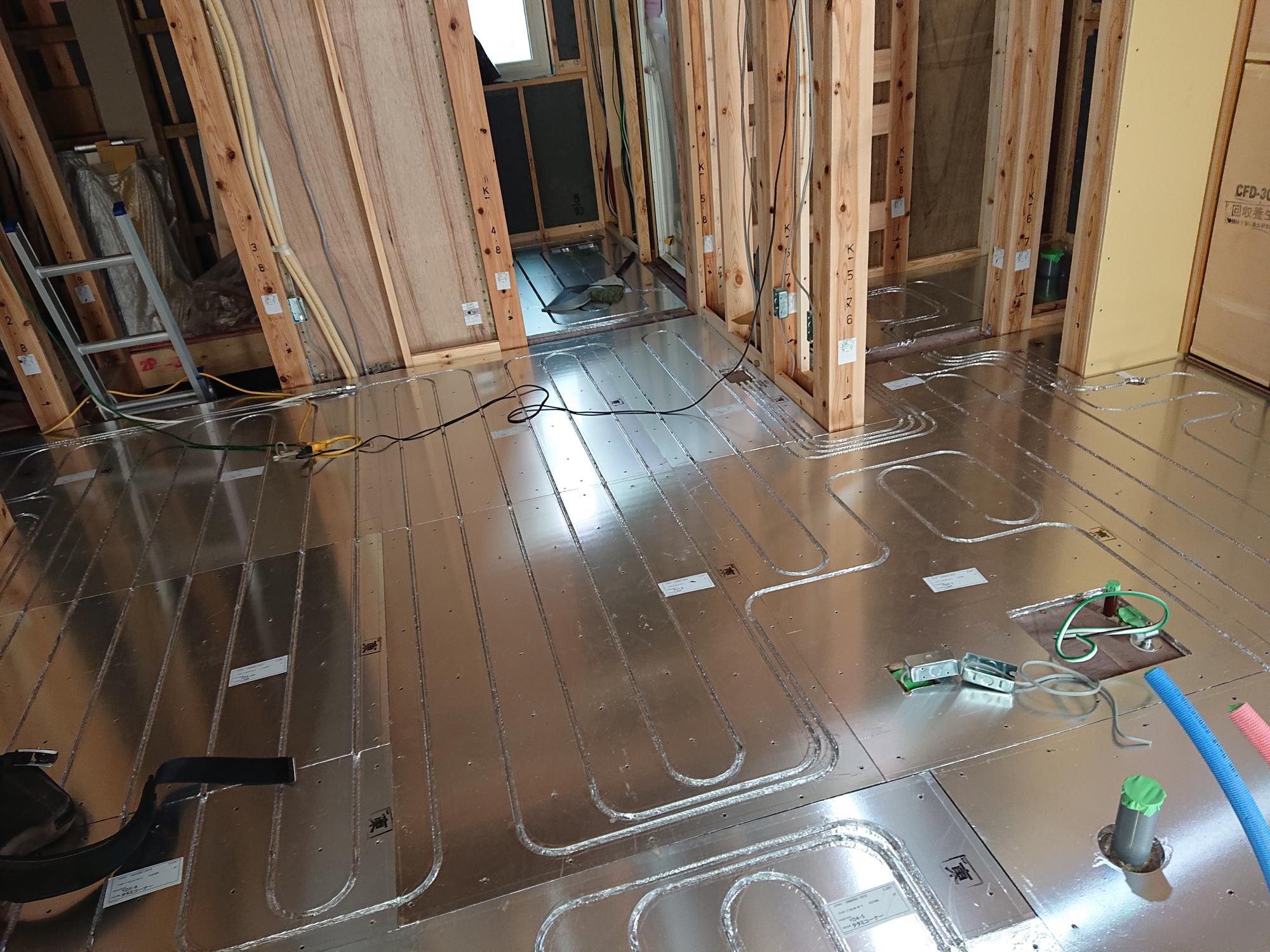 床暖房の施工は、床の下に温水を通す配管や発熱体を設置し、足元から室内全体を暖める仕組みをつくる工事です。床材の下に配管を組み込み、ボイラーと接続することで、床全体が均一に温まるように設計されます。空気を直接暖めるのではなく、床からじんわり熱を伝えるのが特徴で、室内の温度ムラを抑える効果があります。